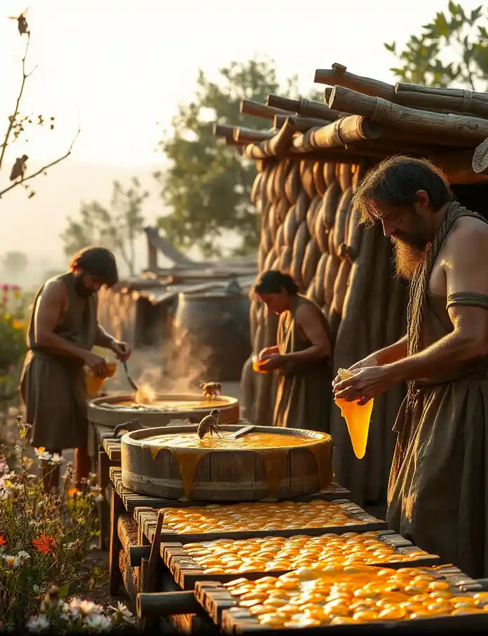 La cire d’abeille avait de nombreux usages : étanchéification des poteries, fabrication d’objets artisanaux, protection de surfaces ou comme matériau pour les luminaires. Elle était un outil technique et culturel majeur bien avant l’apiculture organisée.