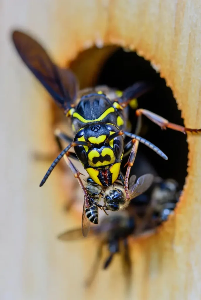 J’ai pu observer que le frelon asiatique ne se nourrit pas exclusivement d’abeilles, mais celles-ci constituent une part importante de son régime, surtout en période de reproduction. Il saisit les abeilles à l’entrée des ruches avec une précision étonnante, souvent en volant au-dessus des colonies et en capturant ses proies en plein vol. Sa taille imposante et sa rapidité font qu’il n’a pratiquement aucun concurrent lorsqu’il chasse autour de vos ruches.